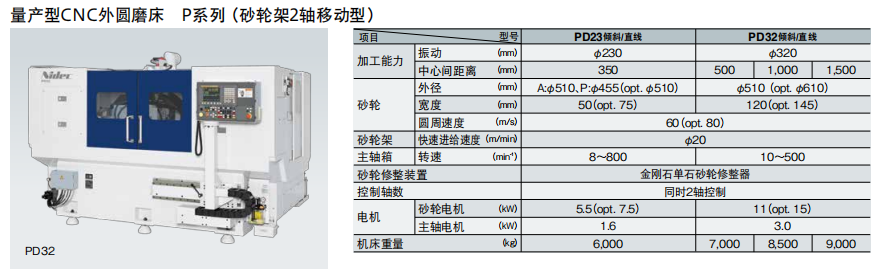 • · 砂輪圓周速度 60 m/s(可選 80 m/s,PD32)的高速重磨削:砂輪軸標配11kW高輸出電機,標準規格為砂輪圓周速度60m/s、砂輪寬度120mm(可選最大145mm),可實現寬砂輪的高速單次重磨削。(PD32)(PD32)