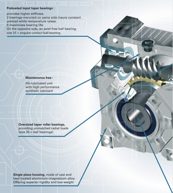 • · Dynabox 蝸輪蝸桿減速機特大錐度滾柱軸承:提供很大的容許載荷