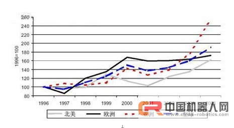 各區(qū)域用戶工業(yè)機(jī)器人定購(gòu)指數(shù)(以1996年作為100)